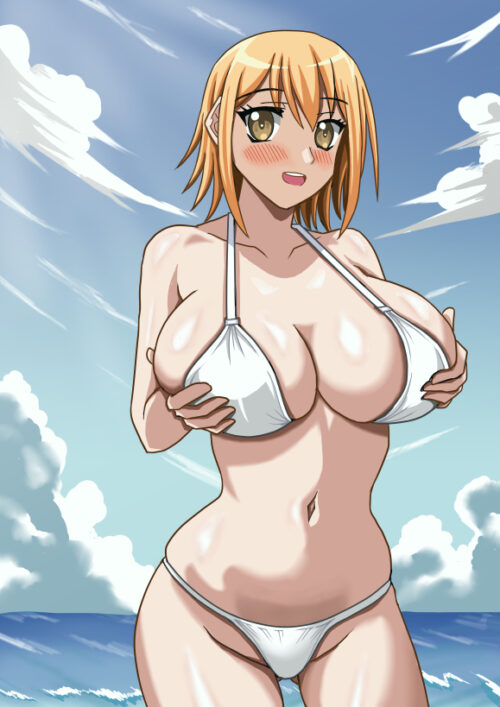 というわけで、Hカップに育った記念に一枚描いてみました。「Hカップに育った胸を強調するポーズにしよう」と考えてこんな一枚になりました。