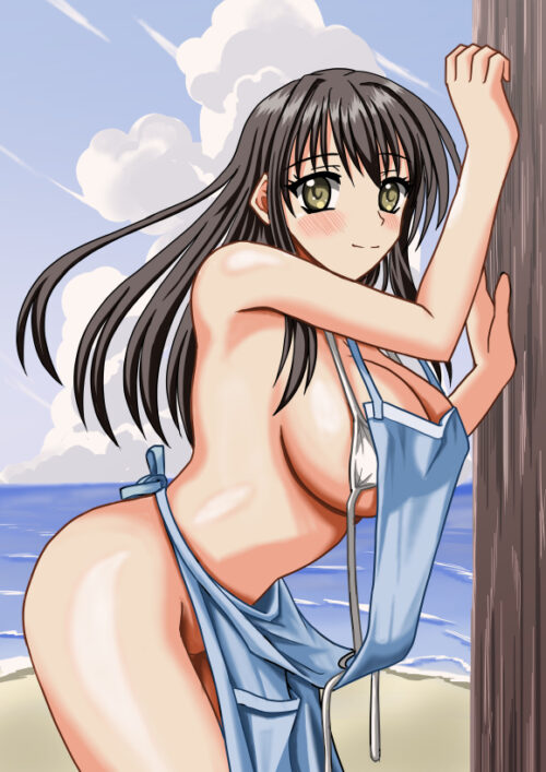 ここ数カ月は、ほとんどのカラーで裸or水着/夏の海の背景という組み合わせで描いてきたのですが、このままでは裸or水着/夏の海しか描けない絵師になってしまいます。10月に入り涼しくなってきたので今までの水着ばかりではなく、衣服も少しずつ着せていく必要があると思い、今回水着にエプロンを追加してみました。